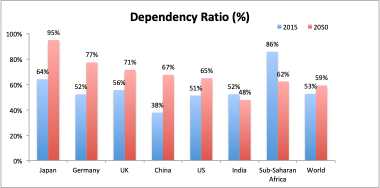 Figure 1 shows the current and projected dependency ratios in different countries. For most developed countries, the dependency ratio will see a sharp increase as the population ages. The ratios of newly-emerging-economies and lower income countries on the other hand, such as India and parts of Africa, are due to decrease due to their demographic structures. Currently, Sub-Saharan Africa has a very high dependency ratio due to its sizeable child population.
