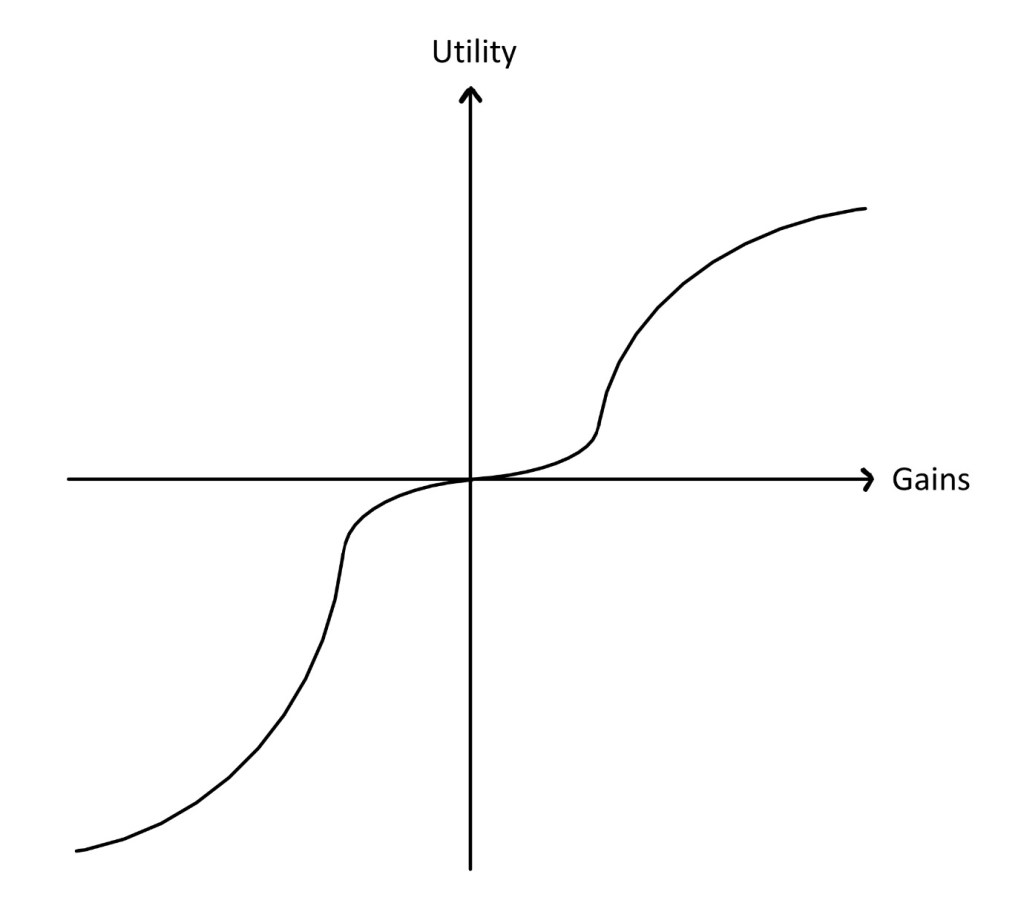 Here, Prospect Theory steps in. It describes a value function where the change in utility after receiving the first £1,000 is less than the second and so on. Whilst this concept, known as diminishing sensitivity, may seem obvious, it is crucial in understanding the leading drivers of human decision-making: risk aversion and loss aversion. Because of this diminishing marginal utility, humans are less likely to accept a chance of a higher windfall when there is the certainty of a smaller one on offer. The larger gain will give slightly greater utility than the smaller one, but the chance of nothing means that many are inclined to take the guaranteed option. This can be best demonstrated by the graph below, which shows utility increasing as gains do but at a slowing rate.