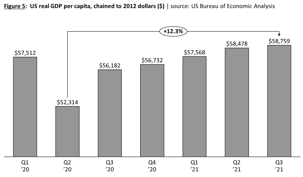 This led to a much tighter job market than anyone had anticipated, with resulting upward pressure on wages.  Finally, both the Fed’s and US Treasury’s stimulus programs made more money available to consumers and businesses alike, helping the economy to recover strongly.  This is evidenced by the growth of real GDP per capita of over 12% since the second quarter of 2020 as shown by Figure 5.