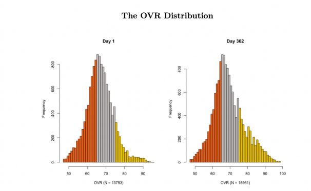 The two graphs above depict the distributions of OVRs (overall rating of a card) throughout the annual cycle of the game. The most significant difference is the increase in cards with OVRs 85 and above towards the end of the cycle. This shows the transition of the ‘power curve’, describing how teams and cards progress throughout the game. There is an increase of almost 400% in the number of cards with OVRs 85 and above throughout the game and the introduction of ultra-high OVRs (95 and above). Both observations show the power curve, forcing players to upgrade their teams to stay competitive. Interestingly, a consequence of this is that the FIFA monetary system is inherently inflationary (the opposite of Bitcoin).