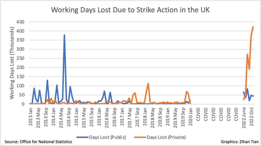 Theoretically, strikes depend on the bargaining power of workers; the more workers that strike, the more likely they are to achieve what they set out to do, as their lost output is more valuable. Moreover, higher skilled workers are less replaceable, and so employers are more likely to agree to their demands to retain them rather than search for a replacement. For example, criminal barristers were given a 15% raise in October 2022, since their skills are relatively rare.