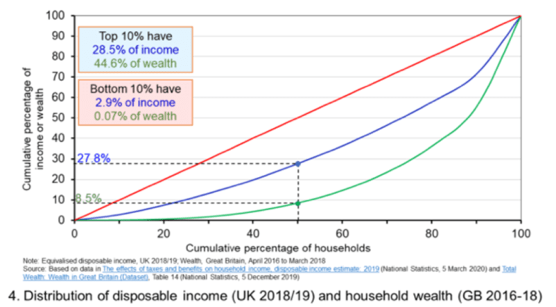 In figure 1, the 45 degree line (red) represents perfect equality, and the more a Lorenz curve sags below this line, the higher the level of inequality; for the UK, the poorest 50% of society only has 8.5% of total wealth. To address the stark inequalities that prevail, an understanding of their root causes is critical.