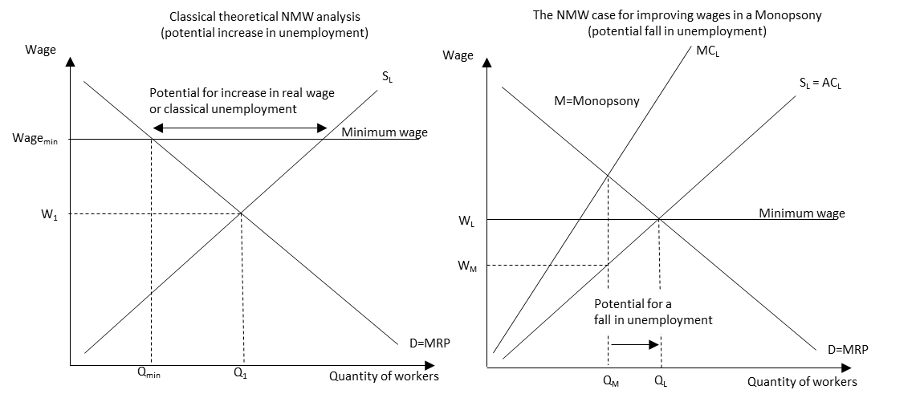 Figure 1: A theoretical framework to analyse the possible effects of introducing a national minimum wage can show both a potential increase and fall in unemployment.