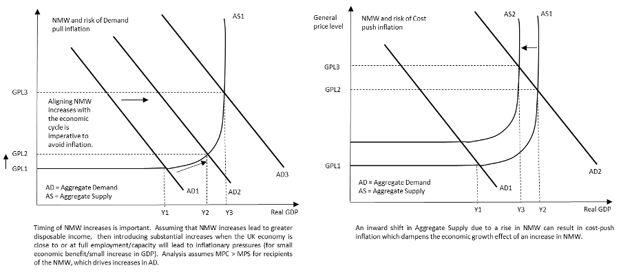 To introduce further sizeable increases to the NMW, timing would be an important factor and policy makers would do well to consider the position of the economy in its economic cycle. Such policy would exhibit beneficial growth if the economy was below full employment, otherwise there is a risk of rising inflation. Therefore, at the current time where the UK is at full employment, increases in NMW will most likely not result in meaningful real economic growth or increases in productivity. That said, the risk of inflationary NMW increases occurring could be mitigated somewhat through well designed and timed supply side policies which would shift aggregate supply outwards allowing for growth and less significant inflation (Fig 3).