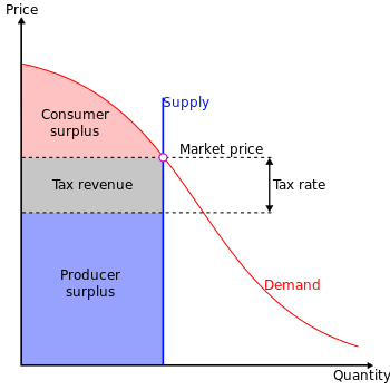 In the graph above, the tax rate reduces demand, but supply remains constant, resulting in no deadweight loss. Source: https://en.wikipedia.org/wiki/File:Perfectly_inelastic_supply.svg