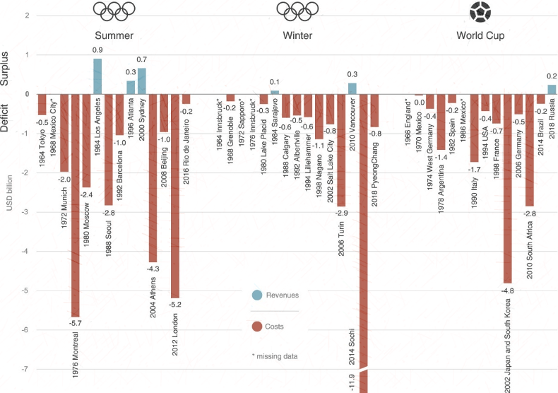 Empirical analysis from past Olympic Games tells us the event is more often than not a financial drain. Research by Martin Muller at the University of Lausanne[6], compared the revenues and costs of the Olympic Games and World Cups between 1964 and 2018 (N = 43), together totalling close to USD 70 billion in revenues and more than USD 120 billion in costs. He found that costs exceeded revenues in four out of five Olympics and World Cups.
