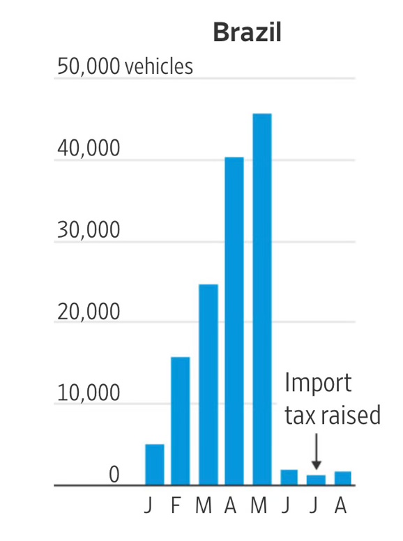 Countries have been increasing their imports of EV’s from China, however when tariffs are introduced to slow these imports very clear effects can be seen. For example, in Brazil where an 18% tariff was introduced on EV imports (moving to 35% in 2026), imports dropped significantly (See graph above, Source; WSJ). The sudden drop in demand indicates that demand for imported Chinese EV’s is highly elastic, in this case. The use of tariffs have been weaponised in particular by the US (100% tariff) and EU (35%), (Source; European Commission), who want to decrease the price competitiveness of Chinese EV’s being sold in their markets. These subsequent tariffs, an example of the West’s intense protectionist policies, will not necessarily hold strong for the future as Chinese production sites have gradually started to emerge particularly in Eastern European nations.