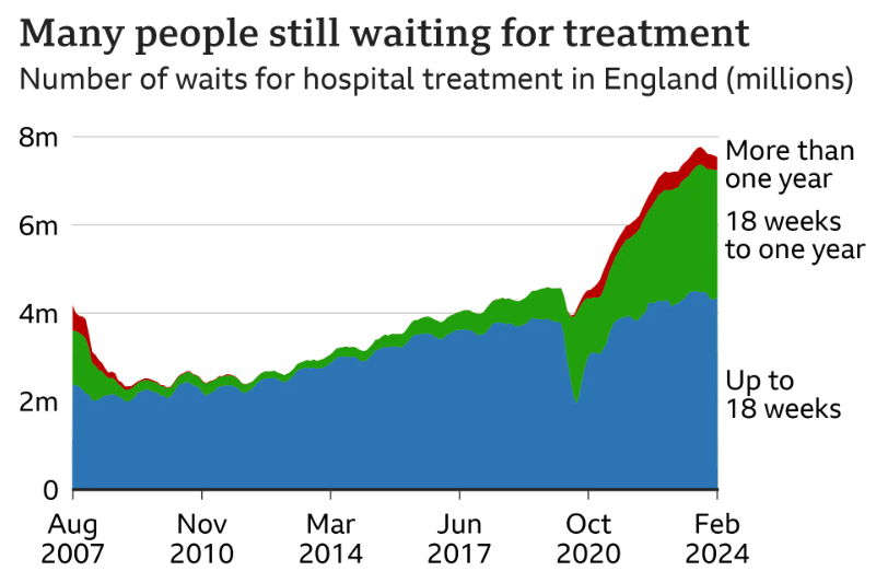 The new Labour government has taken some steps, with waiting lists coming slightly down but still at record levels. It has pledged to hire 7,500 mental health practitioners, and have managed to stop the strikes and increase staff morale, though many feel that the inflation-busting rise is too much. It has pumped £25 billion more pounds into the NHS, but Labour has failed to set out any clear plan to increase efficiency.