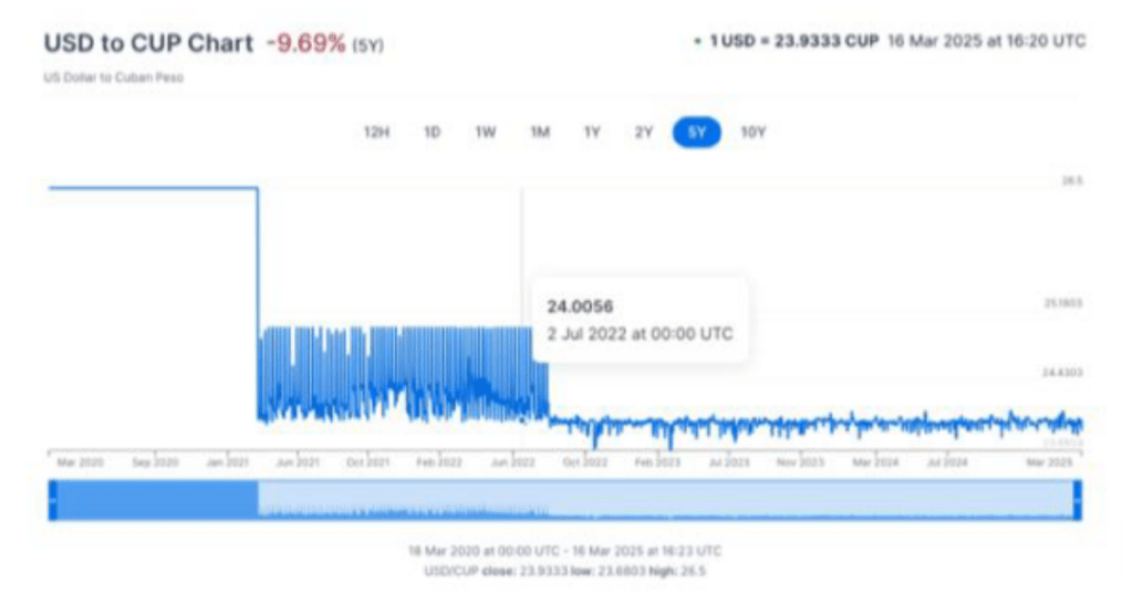The CUP was fixed at a rate of 24:1 CUC, whilst the CUC was pegged to the US dollar. This system brought monetary stability and predictability to a precarious situation — but at a significant social cost. Moreover, the artificial exchange rate put in place by the government led to black market trading, as people knew the real value of the USD was far greater than 24 CUP.