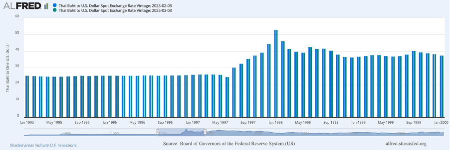 Another risk which comes with less developed economies is the risk of financial contagion, which is the idea that economic crises can spread between neighbouring economies and take hold across an entire region. A good example of the is the Asian financial crisis in 1997. In July 1997 when the Thai government ended the de facto currency peg of the Thai Baht to the dollar the currency saw huge devaluation, as can be seen below. This then lead to similar event in surrounding countries like Malaysia, the Philippines and Indonesia as their governments were forced to take similar actions – devastating investors in all economies affected by this crisis, not just in Thailand, which indicated just how volatile emerging markets can be and how changes which are not necessarily related to the economy can spread from other economies and lead to huge loses.