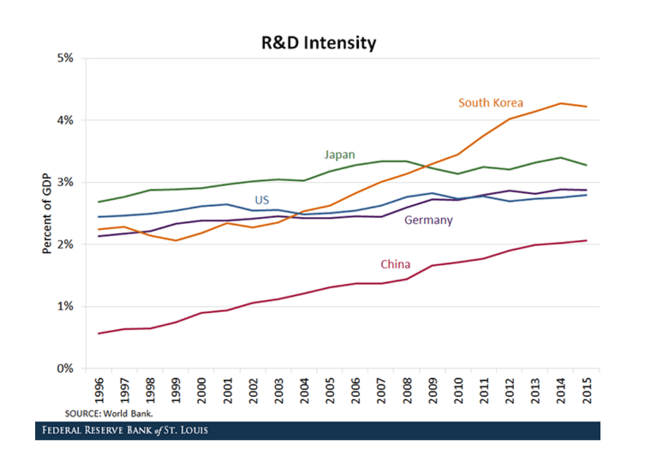 - Research and Development Focus: between 1996 and 2015 South Korea’s Research and Development intensity increased by 88.5% (from 2.24% in 1996 to 4.23 in 2015%) while other already developed economies lagged behind, as can be seen in the diagram below. This allowed South Korea to be competitive with other exporting superpowers as its advancement soared over its counterparts and greatly contributed to the economic growth seen in the country.