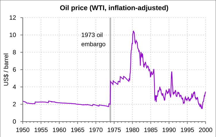 Figure 1: The price of oil adjusted for inflation at 1947 prices (West Texas Intermediate)