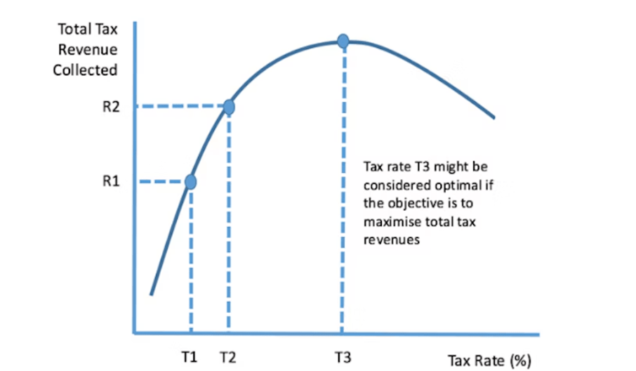 Figure 3: The Laffer Curve here suggests that, while raising tax rates increases revenue initially, at a certain point, higher taxes discourage work, investment, and hiring – leading to lower overall revenue. – (Tutor2u, 2024).