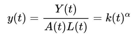 This is possible because the production function Y has constant returns to scale(i.e. when the inputs double the outputs also double), and can therefore be written as output for effective unit of labour (y), indicating the wealth created per input of labour by an economy.