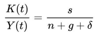 At the equilibrium reached for the value k* mentioned above, since, by definition and as can be obtained from the first equation stated above, K(t)/Y(t) (capital with respect to time divided by labour with respect to time) is equal to k(t)1-α (the steady-state level capital per worker), the equation below can be derived: