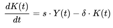 In this equation, the left hand side is the derivative of the capital stock(total value of physical, man-made assets in an economy at a given time) with respect to time; this value is positive when the total savings/investable income (sY(t) where s is the savings rate of income) in an economy is greater than the absolute decay of the capital stock available (δ *K(t)). When the derivative of the capital stock in an economy is positive, this suggests that the total amount of capital stock is growing with respect to time, indicating, aside from the growth of capital, overall economic development and growth.